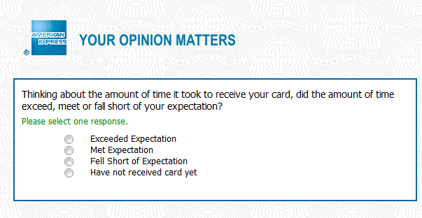 AmEx wanted to know if I received my credit card promptly, but worded it so that the measure or satisfaction was inversely related to the time it took. If it took less time than I expected, I should rate that the time "Exceeded Expectation"?